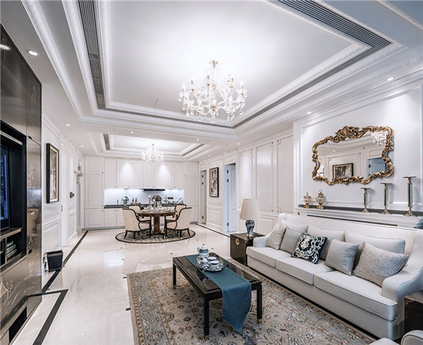 室內(nèi)裝潢以米白色護墻裝飾木板與輕柔的灰色壁布搭配,加以精致的古玩、水晶吊燈和裝飾壁爐,古典中散發(fā)著高貴氣息和流金歲月的浪漫情懷;手縫線和以古董行李箱為靈感的抽屜手挽均巧見心思;精美別致的配飾擺件、璀璨奪目的水晶吊燈和裝飾性壁爐更添風采。