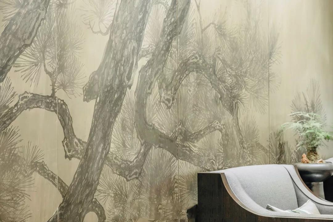 “寓言假物,不取自白”,背景墻畫蒼松挺勁,生機(jī)勃勃,帶給人無限力量。
