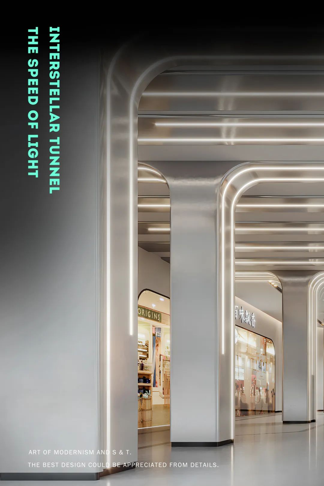 二層連廊區(qū)域是連接室內(nèi)和室外商業(yè)街的通道,金屬質(zhì)感貫穿其中,頂面流光的線條燈配合產(chǎn)生特殊效果,在兩個(gè)空間轉(zhuǎn)換有一種穿越時(shí)空的感覺(jué),配合門(mén)口特殊的科幻造型,在這里打造二層的網(wǎng)紅打卡點(diǎn)。