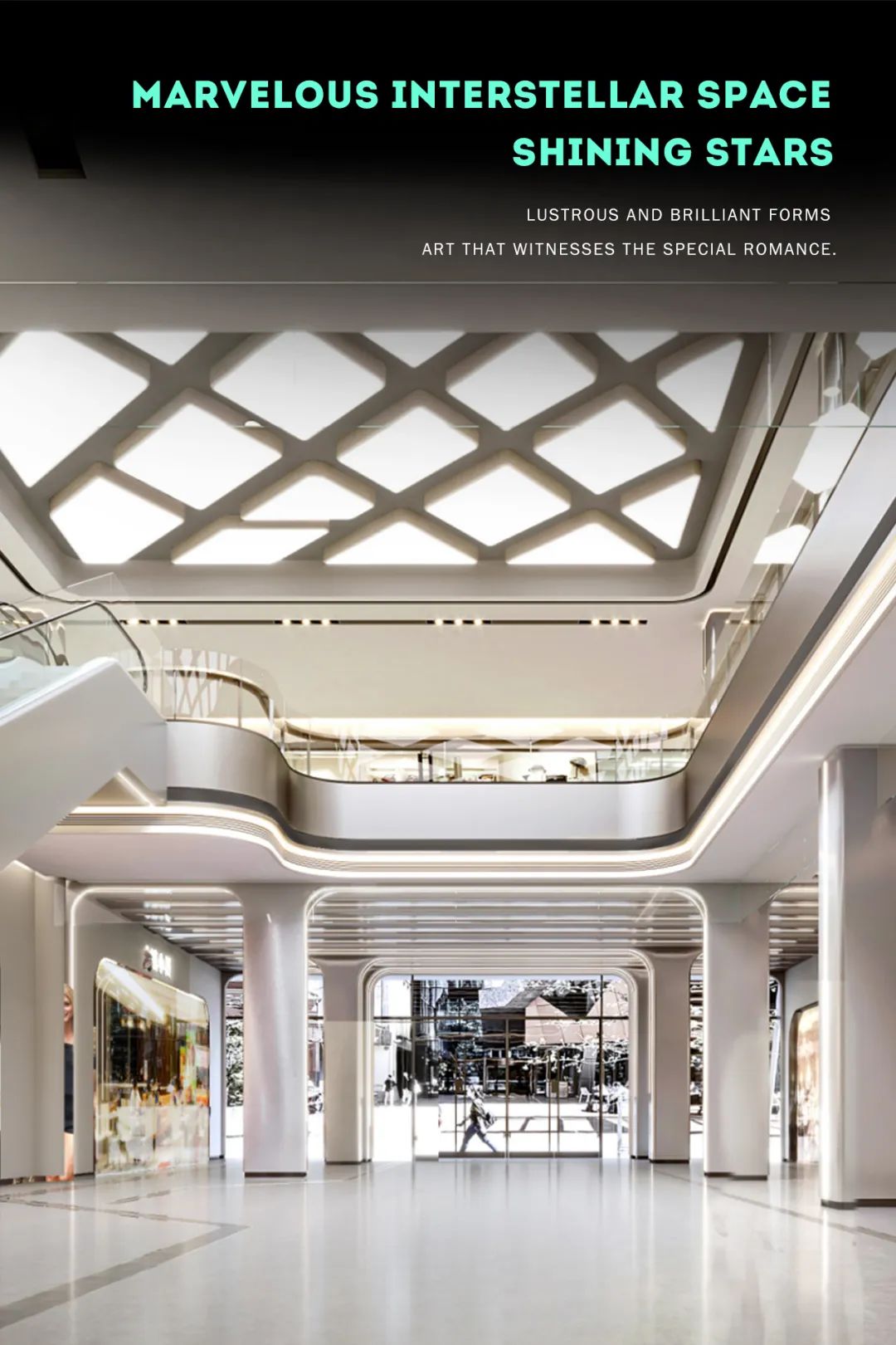首層運(yùn)用星球地表作為東入口的設(shè)計(jì)元素,三層天花中心一個(gè)富有科技感的金三角異形造型來(lái)突顯主題,配合宇宙星環(huán)燈光來(lái)整體打造空間,中心點(diǎn)的商業(yè)美陳裝飾來(lái)豐富空間氛圍。