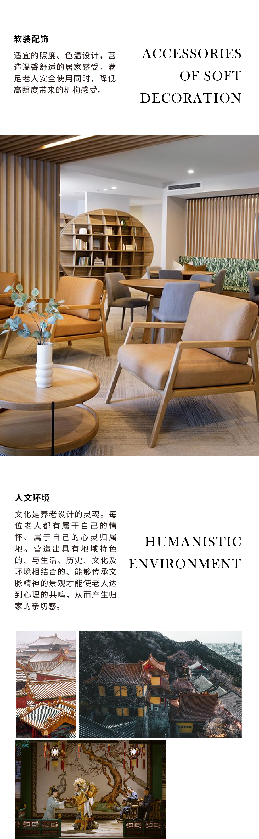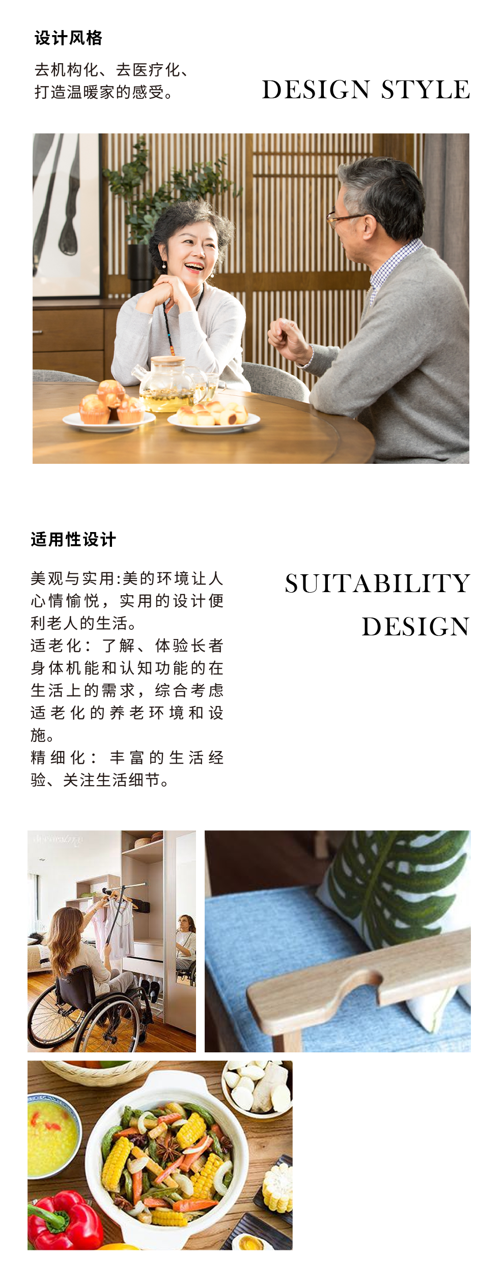 重視環(huán)境心理學(xué)在設(shè)計(jì)中的運(yùn)用,通過造型、色彩、材料、光環(huán)境及陳設(shè)等手段、致力于創(chuàng)造適合老年人需求的舒適、溫暖的生活環(huán)境。